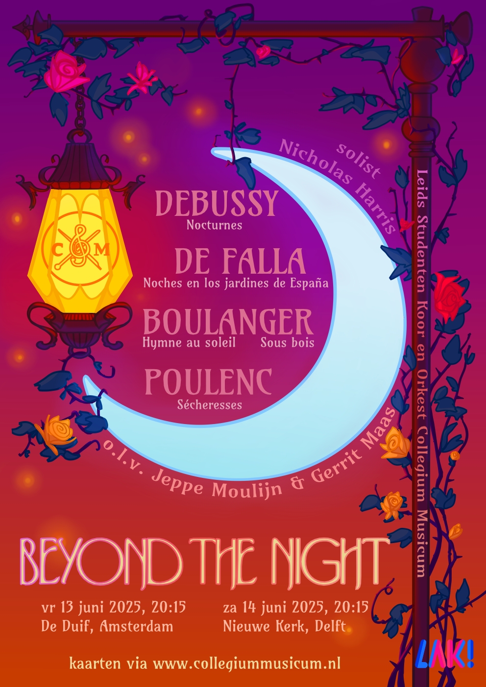 Laat u meenemen in een reis door dag en nacht tijdens het juniprogramma Beyond the Night van L.S.K.O. Collegium Musicum. Pianist Nicholas Harris leidt u door De Falla’s betoverende Spaanse nachten, ons orkest brengt een serenade aan de nacht de Nocturnes van Debussy, het koor bezingt het opkomen van de magistrale zon in Boulangers Hymne au soleil en samen tonen we u de surrealistische zwarte zon in Poulencs Sécheresses.