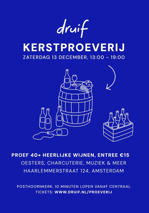 De Druif Kerstproeverij 2025 is de eerste grote overzichtsproeverij van Druif.nl. Druif.nl is een nieuwe wijnwebshop, opgericht door influencer Sjoerd Kist, met een focus op hoge kwaliteit wijnen en een heldere video uitleg bij elke fles. Een onwijs leuk event, met heerlijke wijnen, lekker eten, muziek en een kerstbal voor de liefhebber. De Druif wil zoveel mogelijk mensen laten proeven wat de kwaliteit van de wijnen is. Een proeverij die zo gezellig is dat mensen de hele dag blijven plakken.