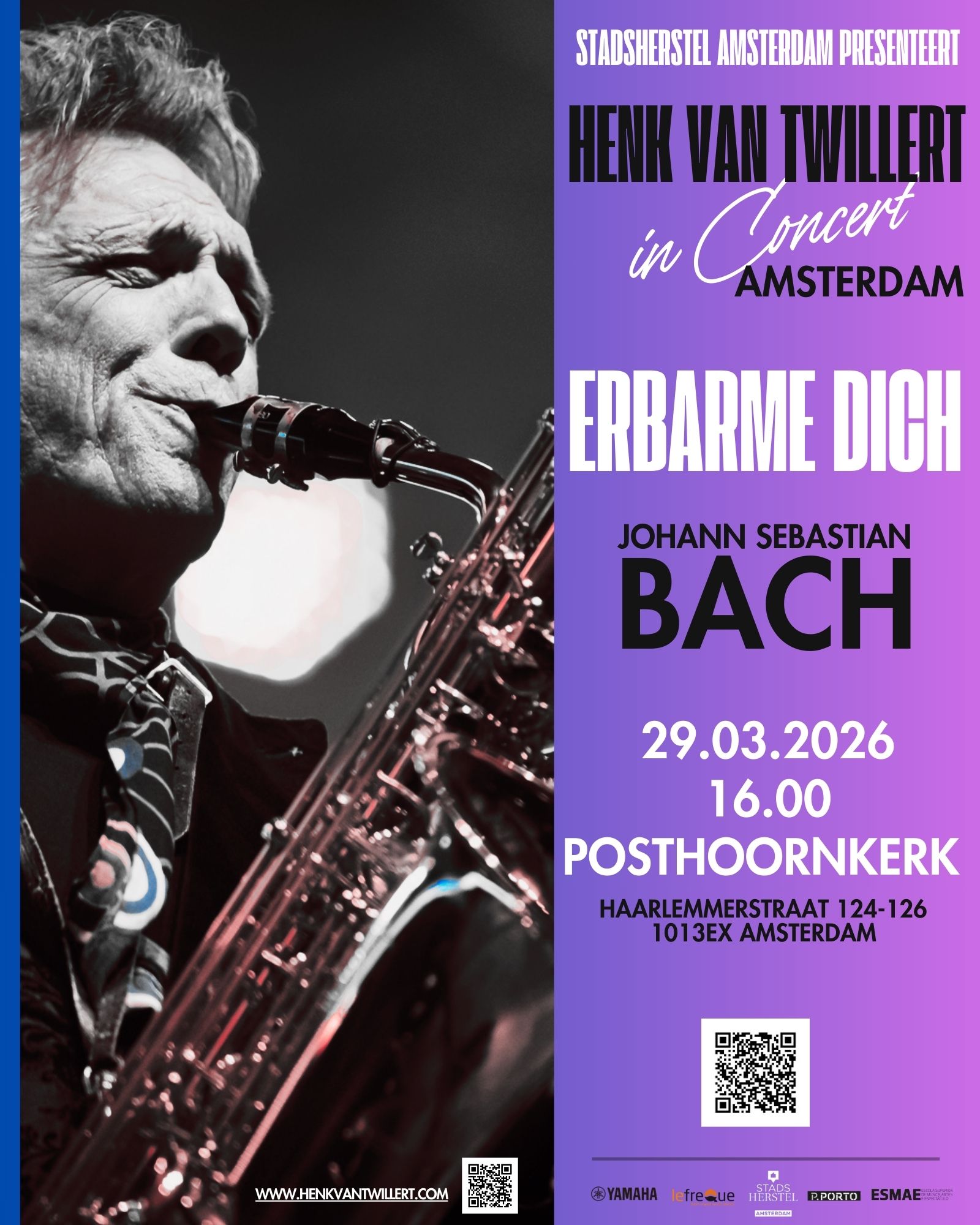Op Palmzondag vult de Posthoornkerk zich met ontroerende klanken tijdens ”Erbarme Dich”. Tijdens dit bijzondere concert klinken hoogtepunten uit Bach’s Mattheus Passie, een werk dat al jarenlang een vaste plek inneemt bij Van Twillert’s Paasconcerten in Amsterdam. Daarnaast staan de tijdloze Cello Suites van Bach op het programma, in bewerkingen die Henk speciaal maakte voor baritonsaxofoon.