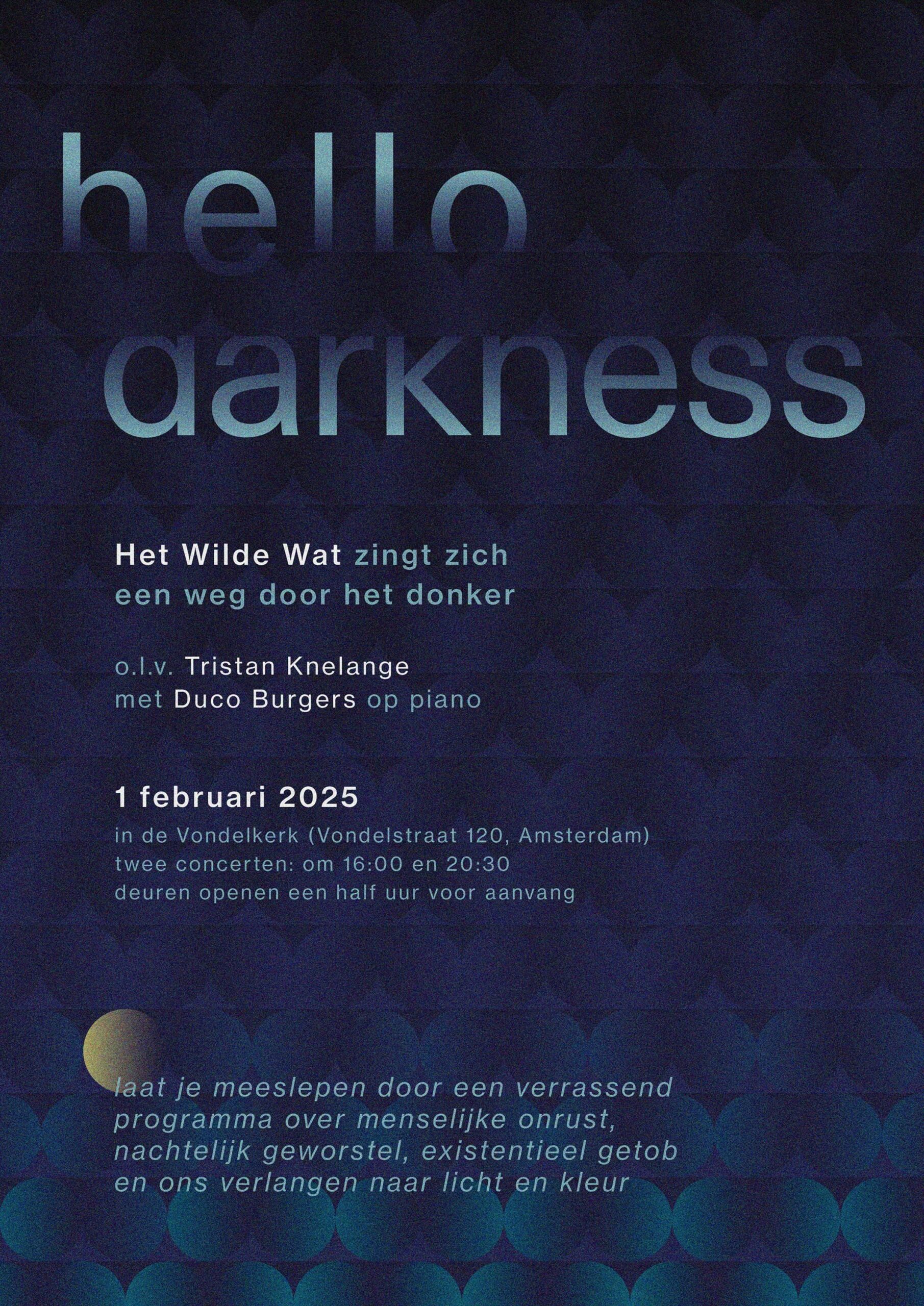 Concert van Het Wilde Wat onder leiding van Tristan Knelange. Laat je meeslepen door een verrassend programma met muziek van o.a Brahms, Purcell, Ola Gjeilo, Imogen Heap en Stevie Wonder, over menselijke onrust, nachtelijke geworstel, existentieel getob en ons verlangen naar licht en kleur.