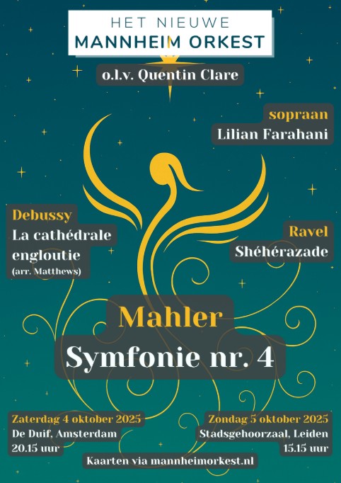 Het Nieuwe Mannheim Orkest o.l.v. Quentin Clare voeren La cathédrale engloutie van Claude Debussy (arr. Matthews), Shéhérazade van Maurice Ravel en Symfonie nr. 4 van Gustav Mahler uit, met sopraan Lilian Farahani als soliste.