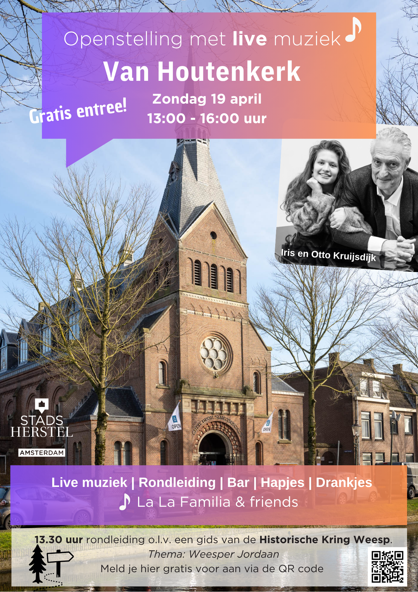 Op zondag 19 april van 13.00 tot 16.00 uur bent u van harte welkom bij een gezellige middag met live muziek van La La Familia and friends. Onder de musici bevinden zich onder andere Iris en Otto Kruijsdijk. Tijdens deze middag wordt om 13.30 uur een gratis rondleiding aangeboden door de Historische Kring Weesp.