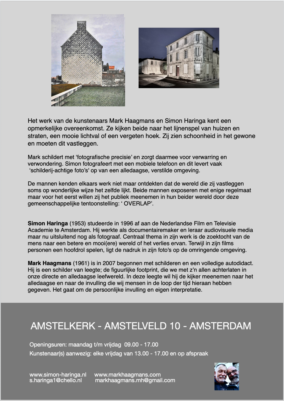 Fotograaf Simon Haringa exposeerde eerder in 2017 in de Amstelkerk met de tentoonstelling AMSTERDAM MOBIEL. In januari 2026 komt hij terug, deze keer samen met kunstschilder Mark Haagmans. Beiden blijken vaak eenzelfde op de hen omringende wereld te hebben; stilte, leegtes en vergeten hoeken trekken hun aandacht. Zij leggen dit vast, wat opmerkelijke en ongebruikelijke beelden oplevert die elkaar soms op een wonderlijke manier overlappen.