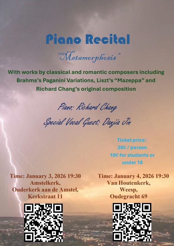 De Nederlandse pianist en componist Richard Chang presenteert samen met sopraan Danjia Jin op 4 januari het programma Metamorphose. Chang, een dubbeltalent dat reeds een Doctor of Musical Arts in Piano Performance behaalde en momenteel een doctoraat in Composition volgt aan de University of Miami, neemt het publiek mee op een reis door drie eeuwen muzikale transformatie.
