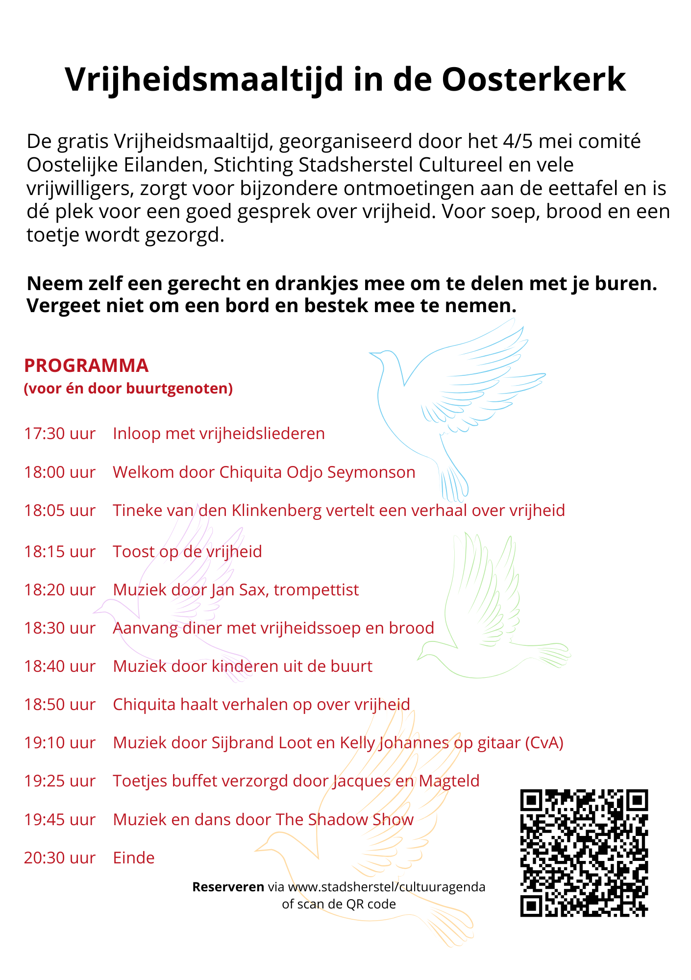 Op 5 mei schuift heel Nederland aan bij een Vrijheidsmaaltijd. Aan de eettafel ontmoet je nieuwe gezichten, vinden we elkaar in de verhalen die we delen over vrijheid en onvrijheid en veranderen onbekenden in bekenden. Wie je ook bent, samen eten is dé manier om elkaars wereld beter te leren kennen. Georganiseerd door het 4/5 mei comité Oostelijke Eilanden, in samenwerking met Stichting Stadsherstel Cultureel en vele vrijwilligers.