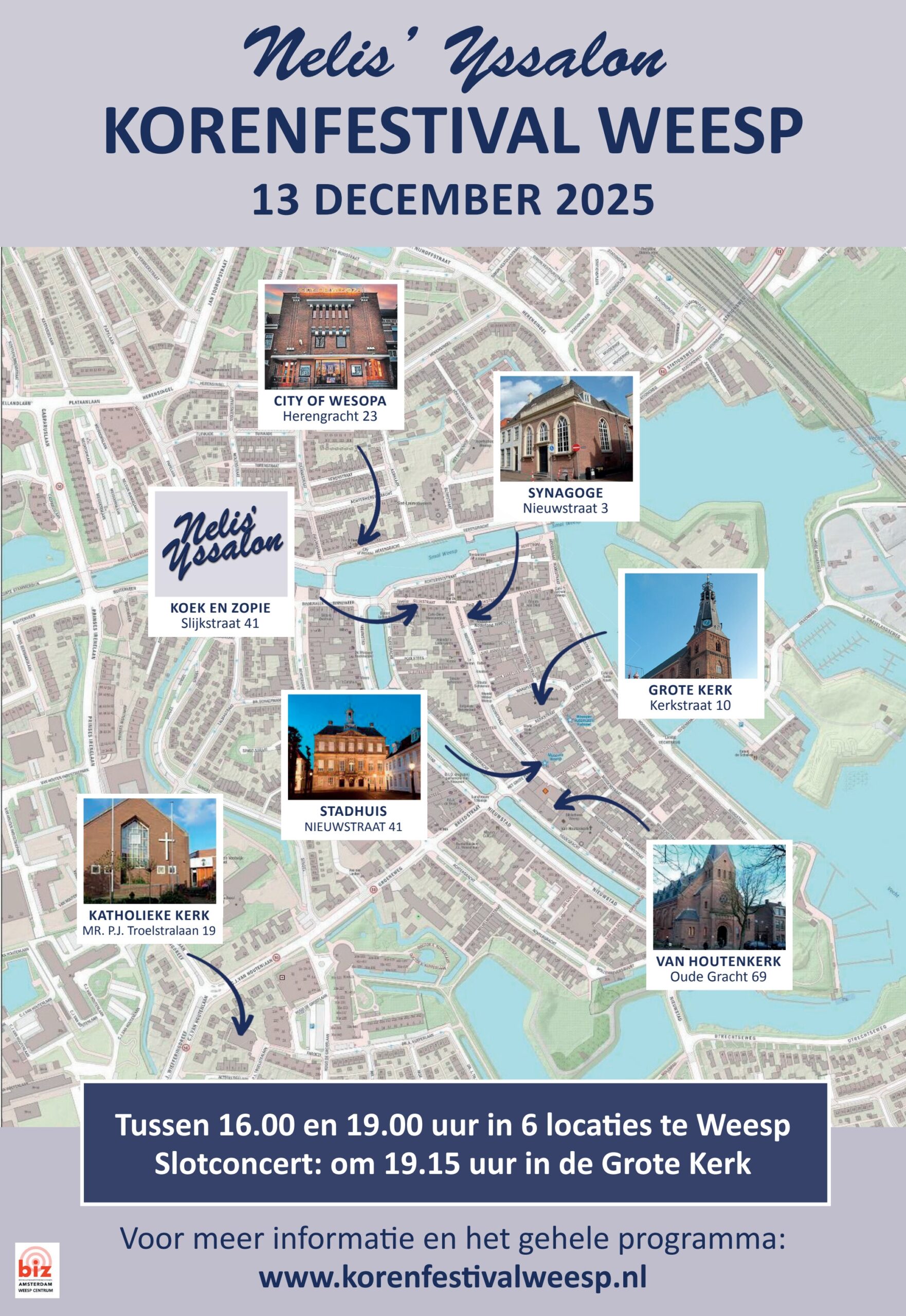 Op zaterdag 13 december vindt het 24e Korenfestival plaats in Weesp. Kom luisteren naar de prachtige samenzang van in totaal 18 deelnemende koren, op 6 verschillende locaties.
