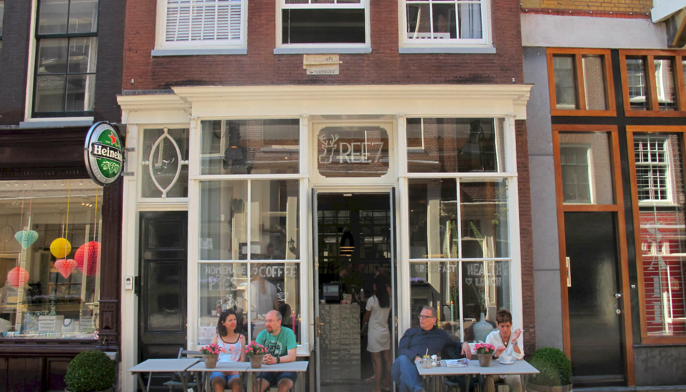 Reestraat 7, AmsterdamDit pandje valt vooral op door de bijzondere erkervormige uitstalkasten als etalage, die bij de continue modernisering van winkelpuien inmiddels bijna overal uit het straatbeeld verdwenen zijn maar die hier bewaard zijn gebleven. En dat ondanks de uitslaande brand die hier in 1905 een dameshoedenzaak – enkele decennia eerder nog met de naam De Nieuwe Fakkel – in vuur en vlam zette.