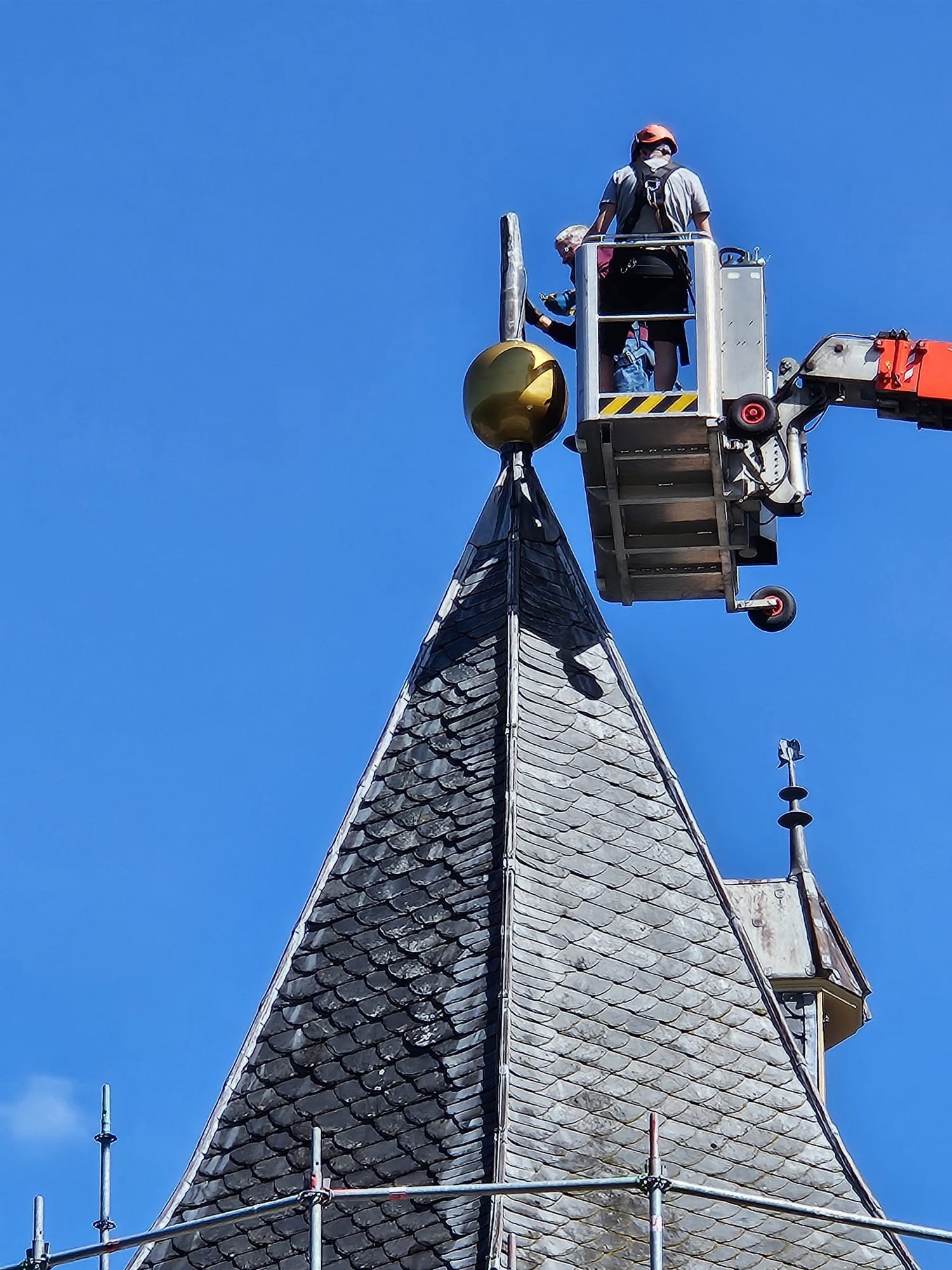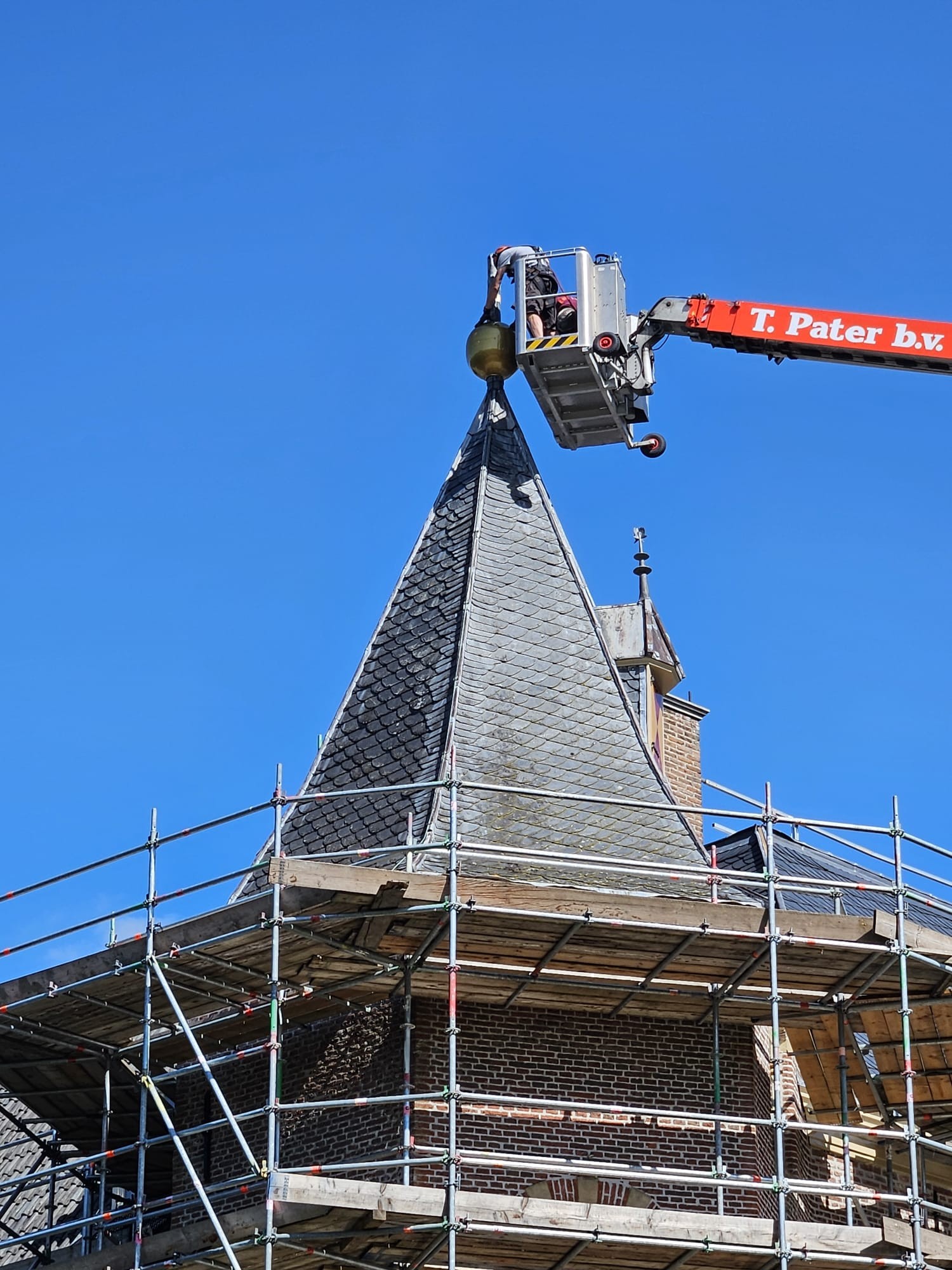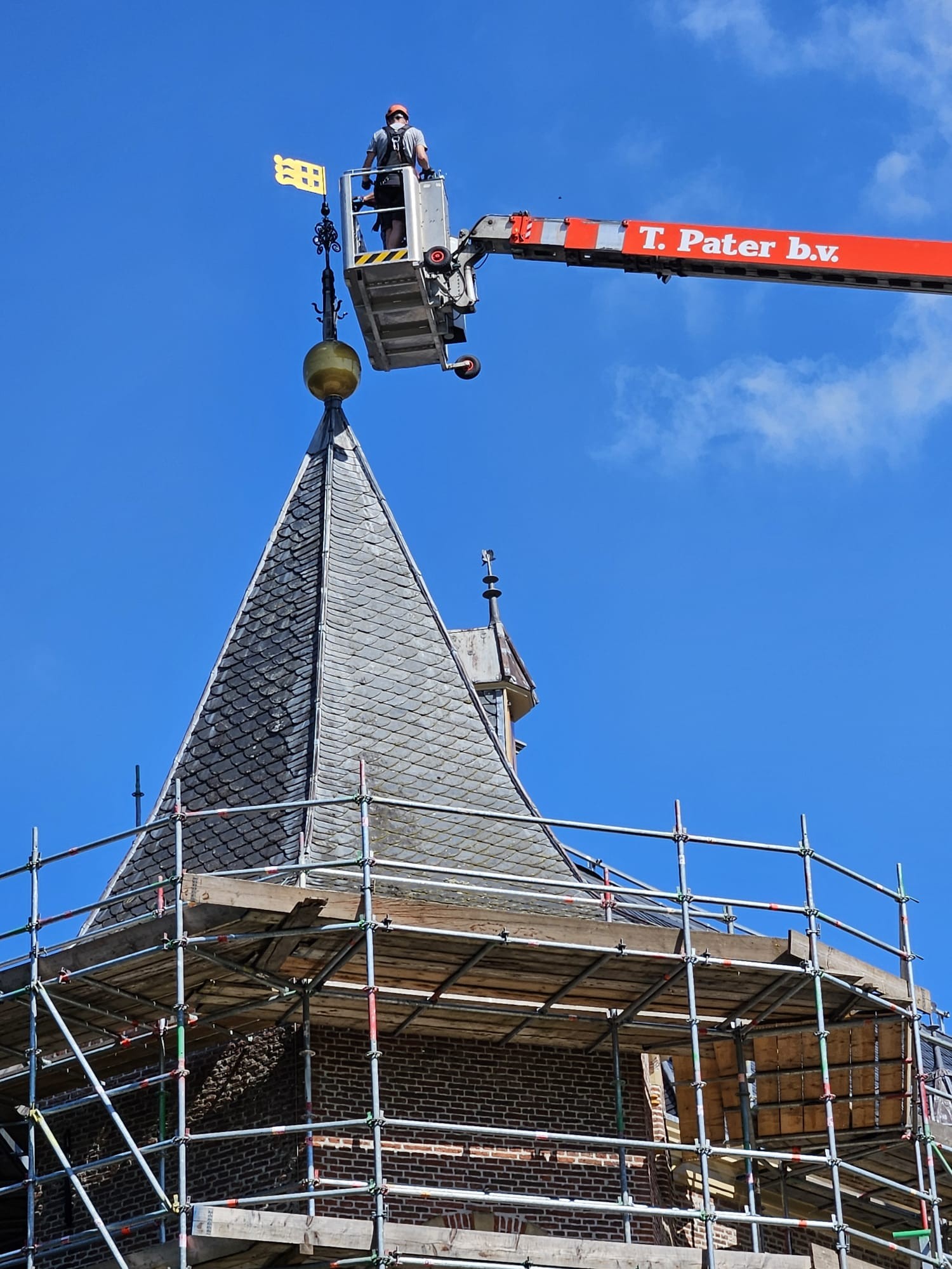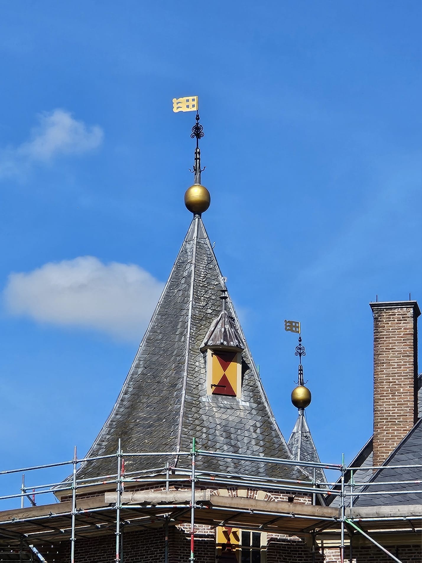 Hieronder ziet u de foto’s die wij maakten op donderdag 17 juli 2025. De bollen en de vaantjes werden toen weer op de kasteeltorens geplaatst. Daarmee bereikten we het hoogste punt van de restauratie.