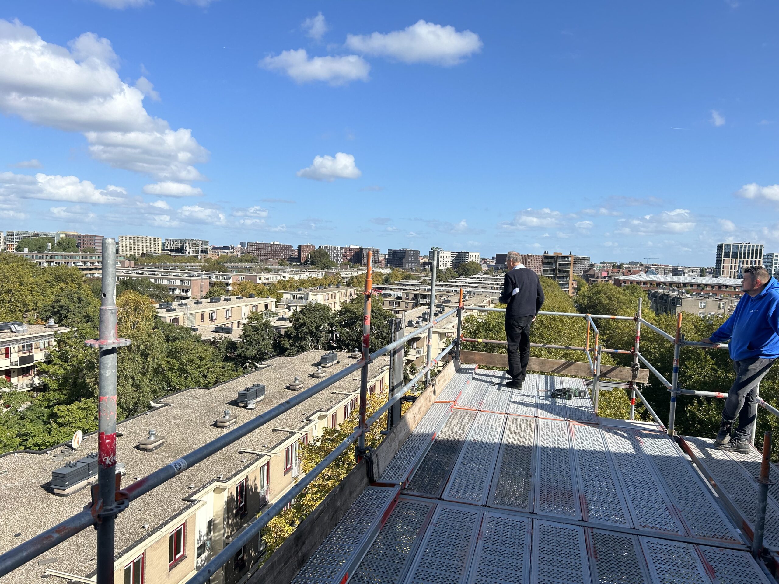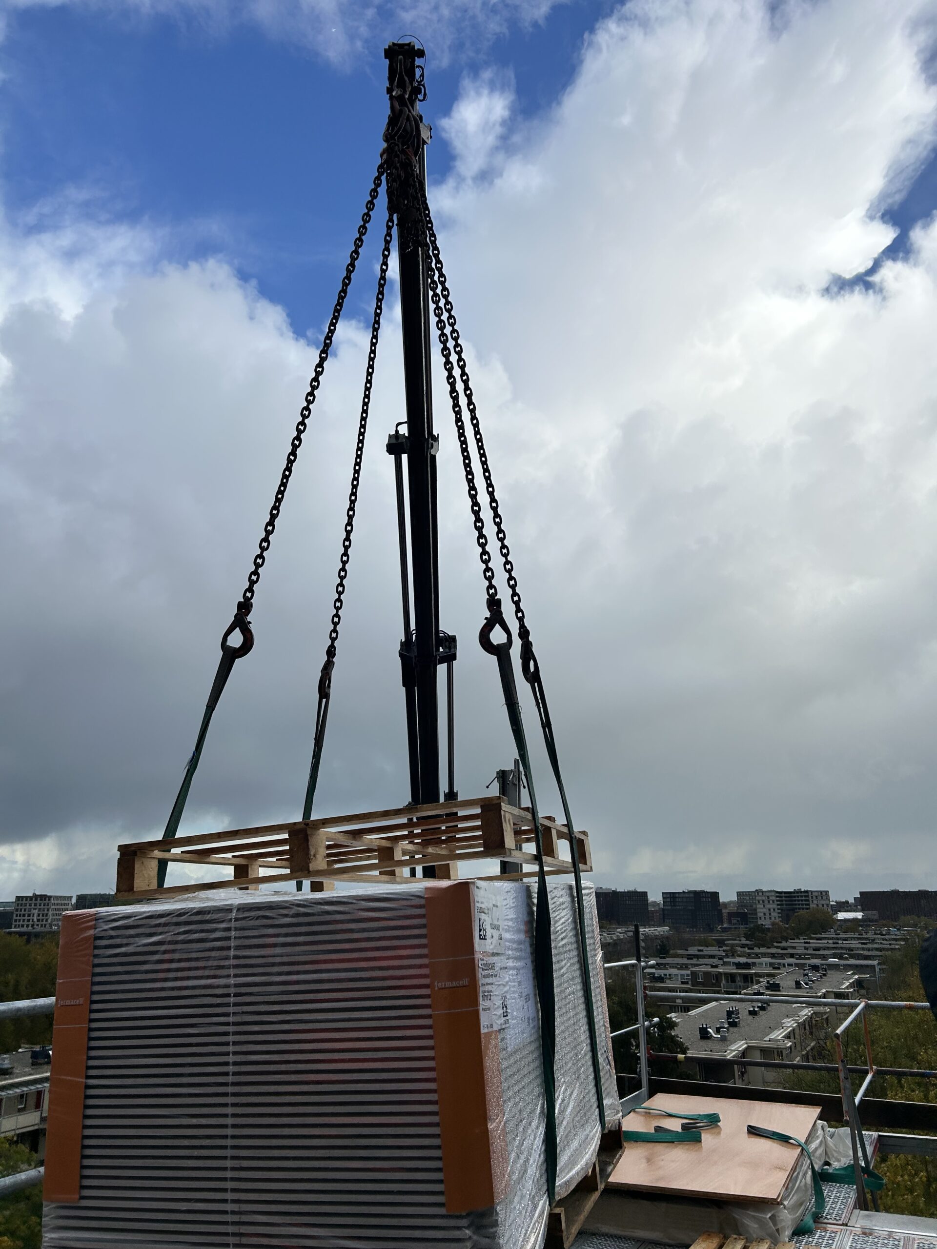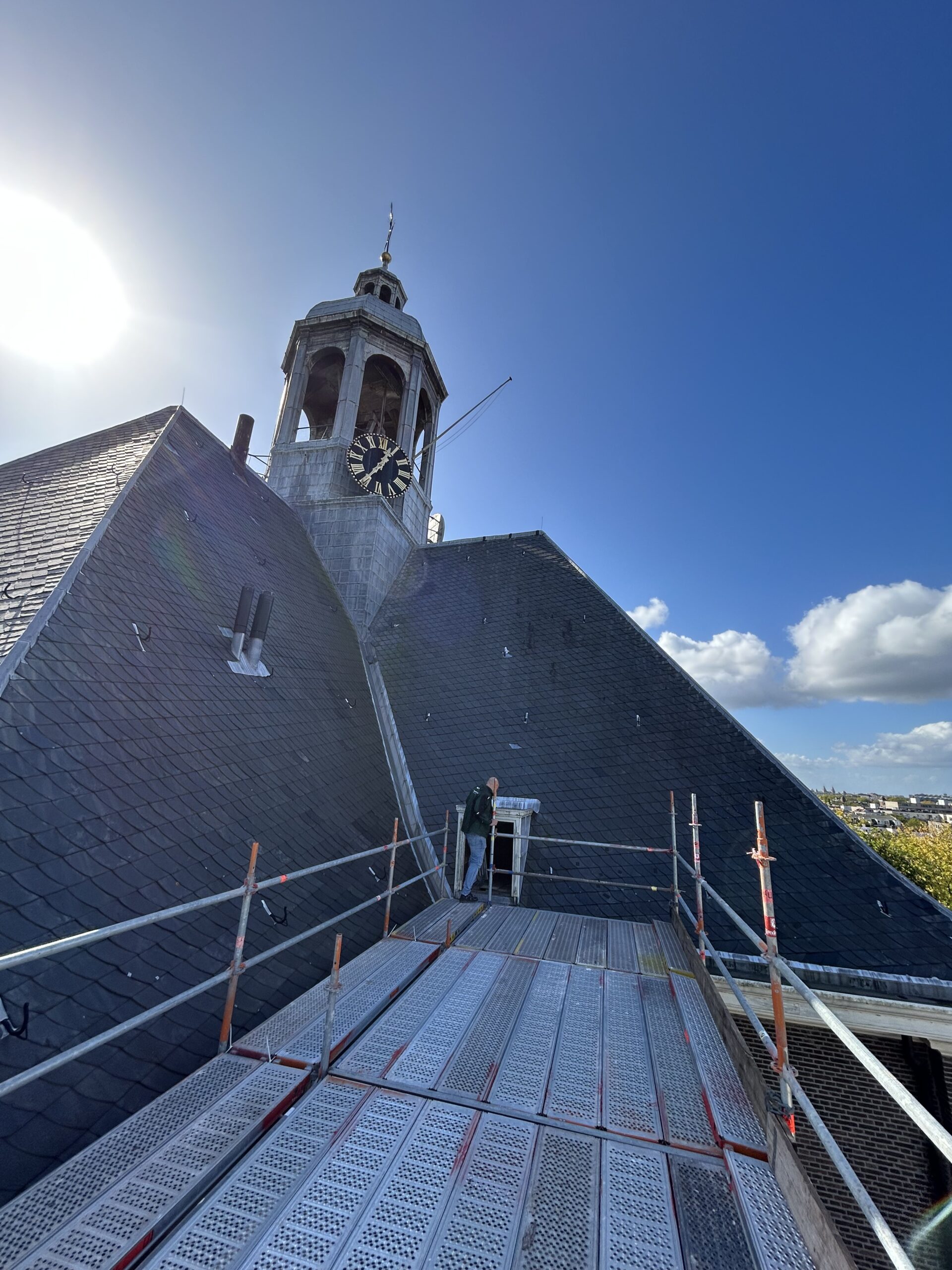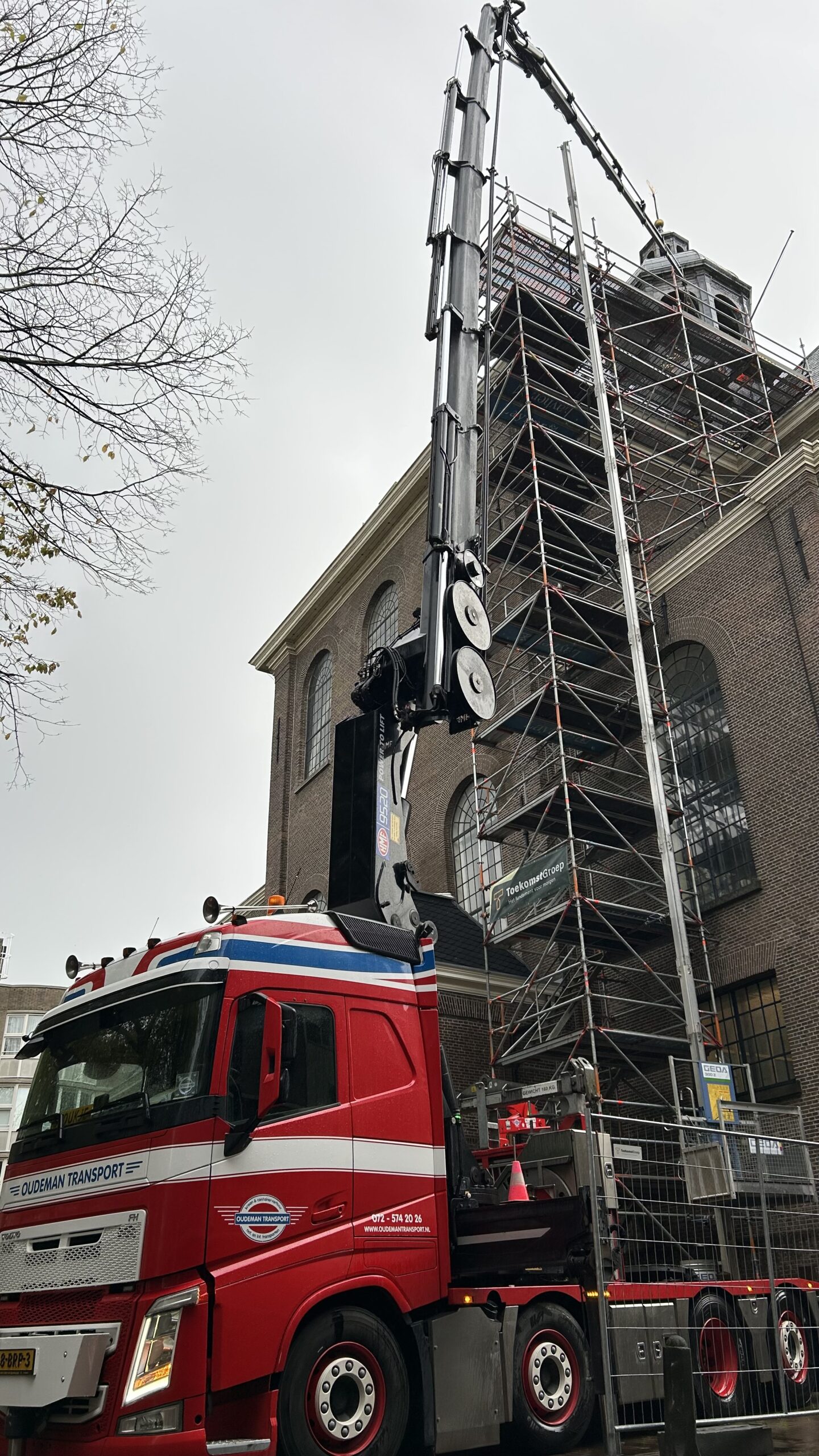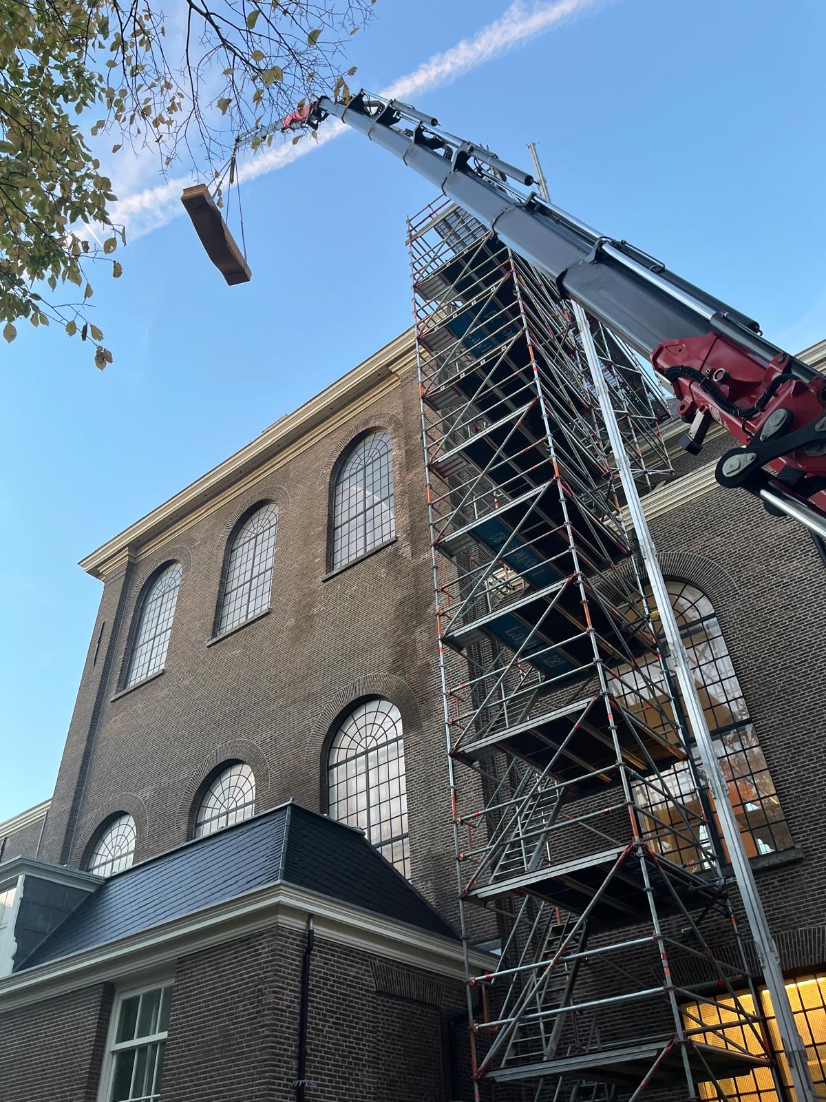 Eerst maakten we een groot plateau buiten de kerk, op hoogte van de zoldervloer. Vervolgens bracht een grote kraan de materialen vanaf de grond naar het plateau op 25 meter hoogte. Vanaf het plateau werden de materialen via een rollerbank door een klein dakkapelletje naar binnen gerold, zodat ze daarna verwerkt konden worden.