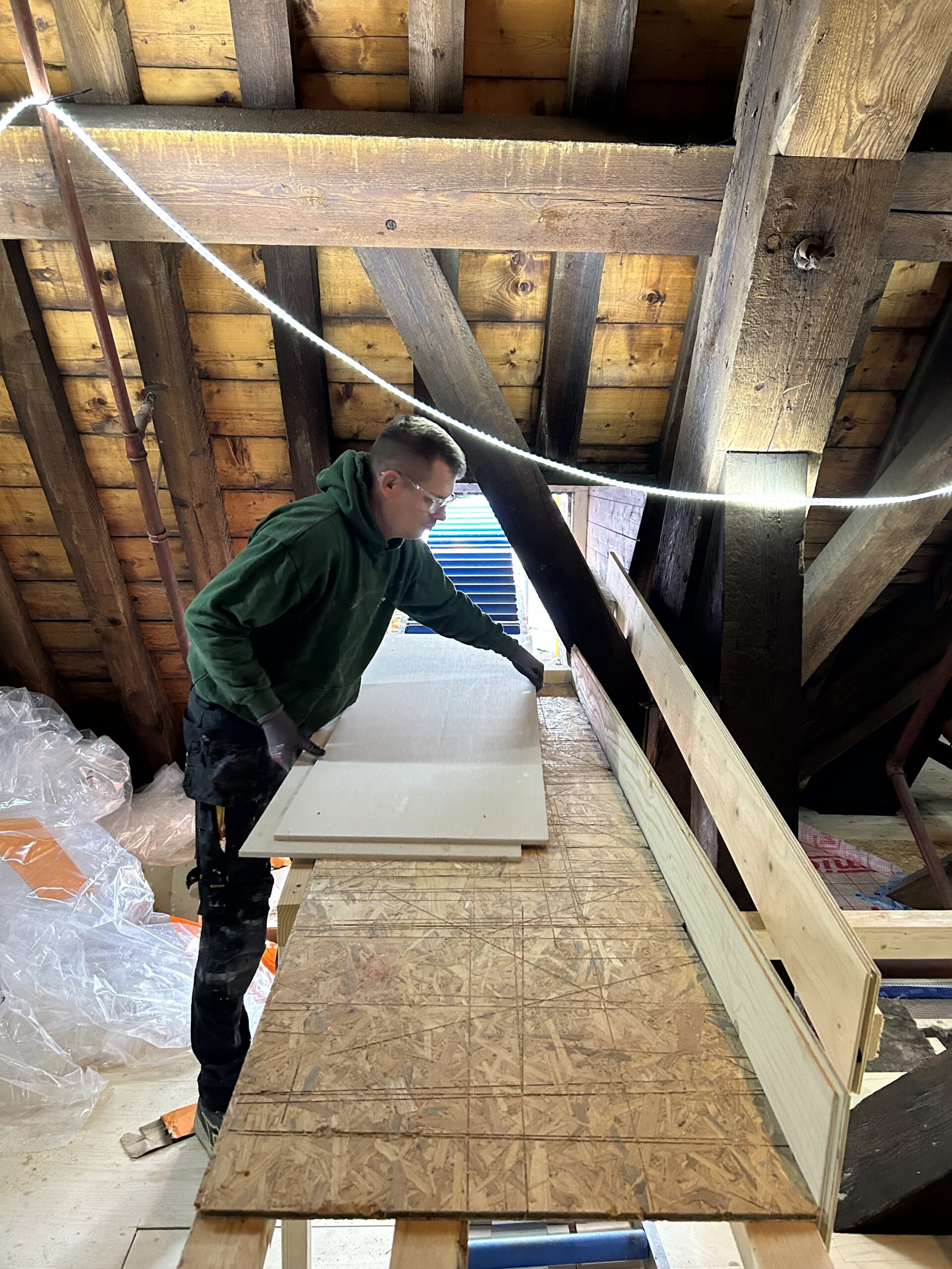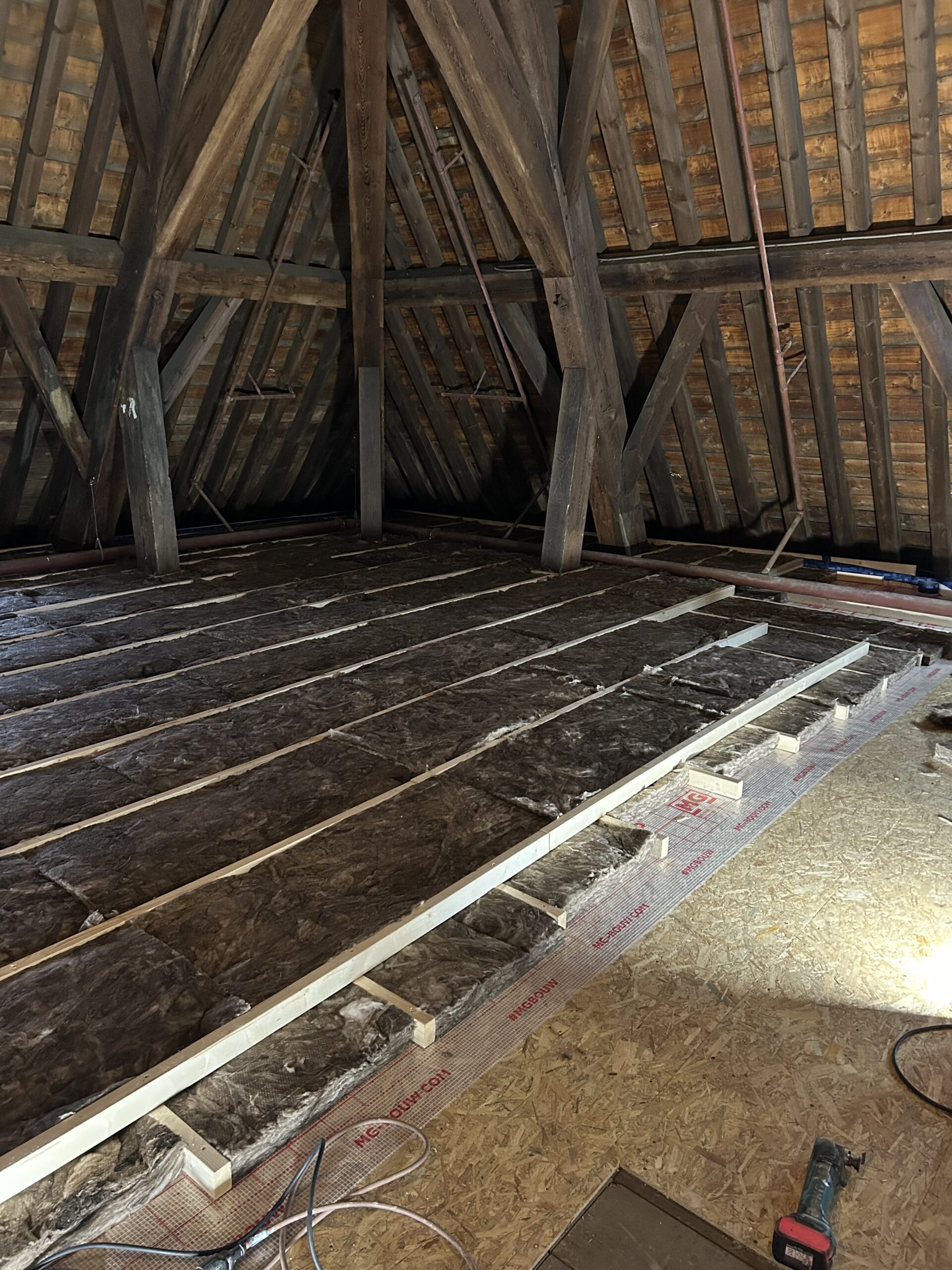– Glaswoldeken: We gebruiken een onbeklede glaswoldeken, specifiek voor thermische, akoestische en brandveilige isolatie van houtconstructies voor het isoleren van de vloer. Het gaat om de Knauf Naturoll 035 isolatierol met ECOSE® Technology. ECOSE® Technology betekent dat er een bindmiddel op basis van plantaardige grondstoffen wordt gebruikt om de glaswolvezels bij elkaar te houden. Het deken is geurlozer en minder irriterend voor huid en ogen.