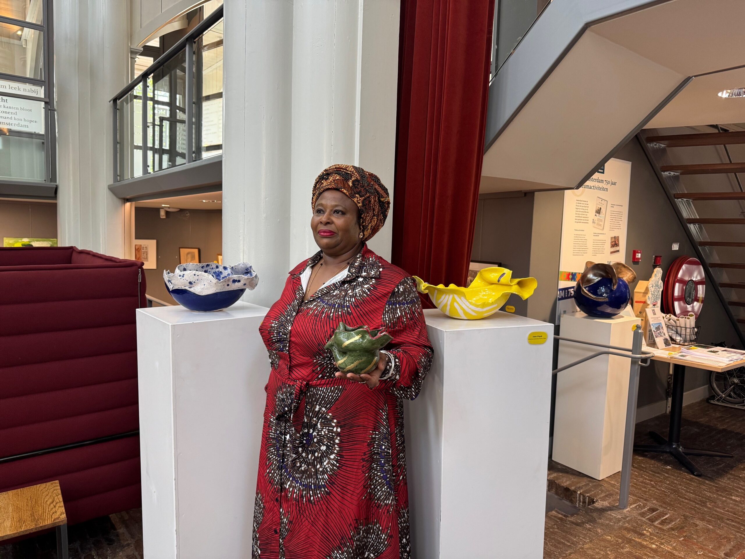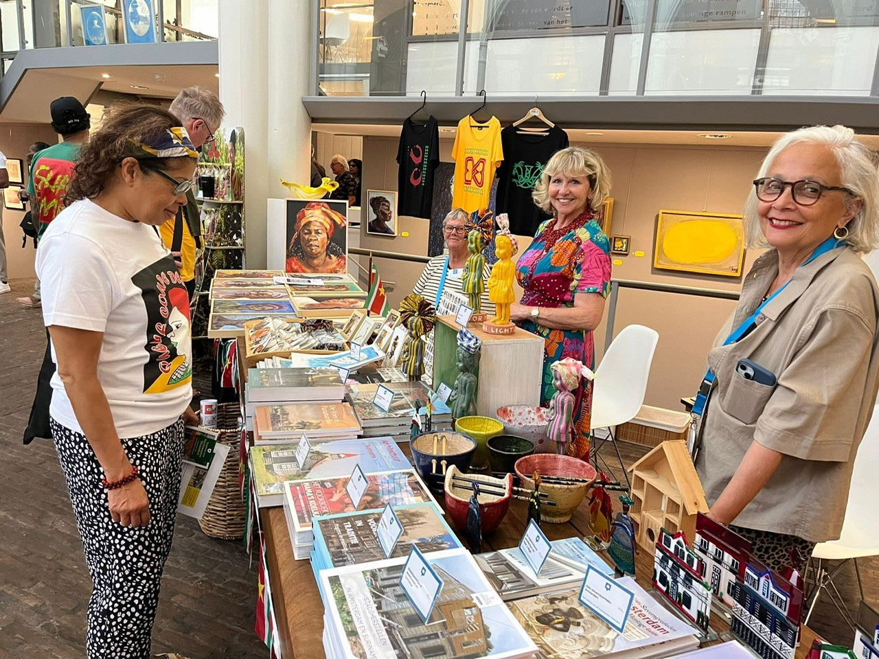Kunstenaar Gerda Dapper schonk ons 18 kunstwerken om te veilen en we hebben ook een Keti Koti hoofddoek voor hetzelfde doel gekregen van een zeer betrokken bezoeker van alle edities van de Surinaamse Maanden.